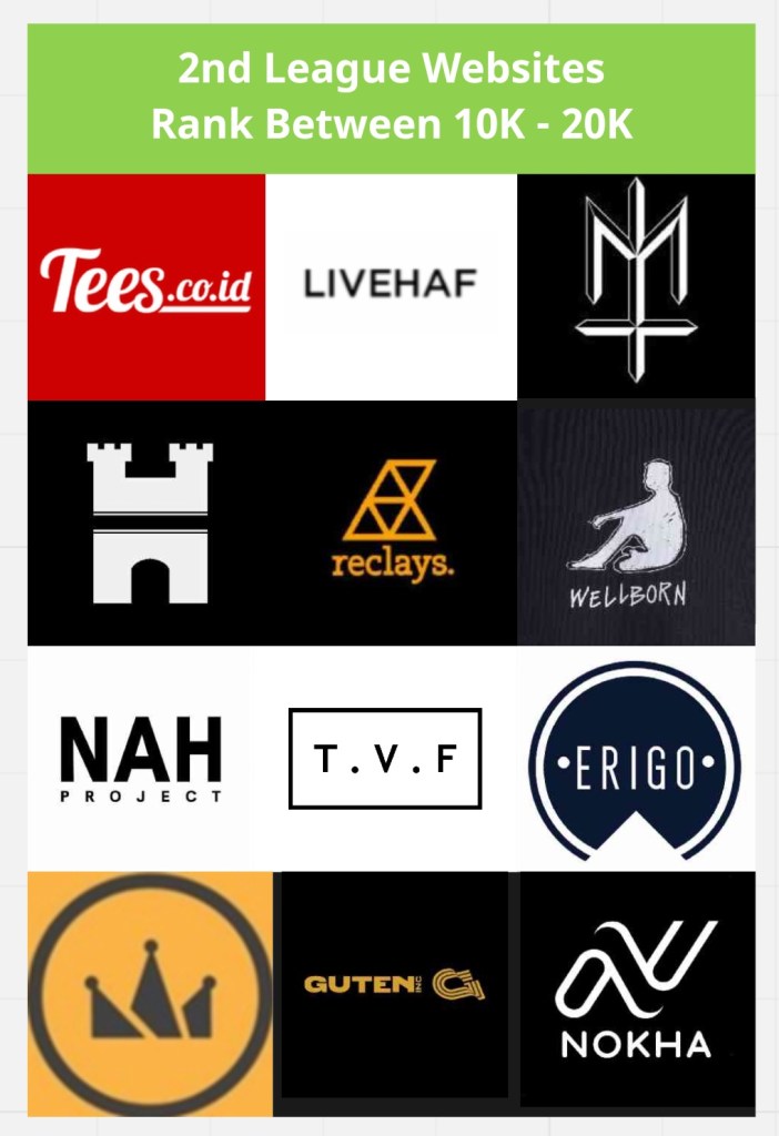 Di liga paling tinggi, website-website dengan ranking di bawah ranking 10.000 nasional, terlihat justru brand-brand starter lah yang mendominasi. Semua brand yang menduduki liga ini secara konsisten mendatangkan 100K – 500K unique visitor per bulan.