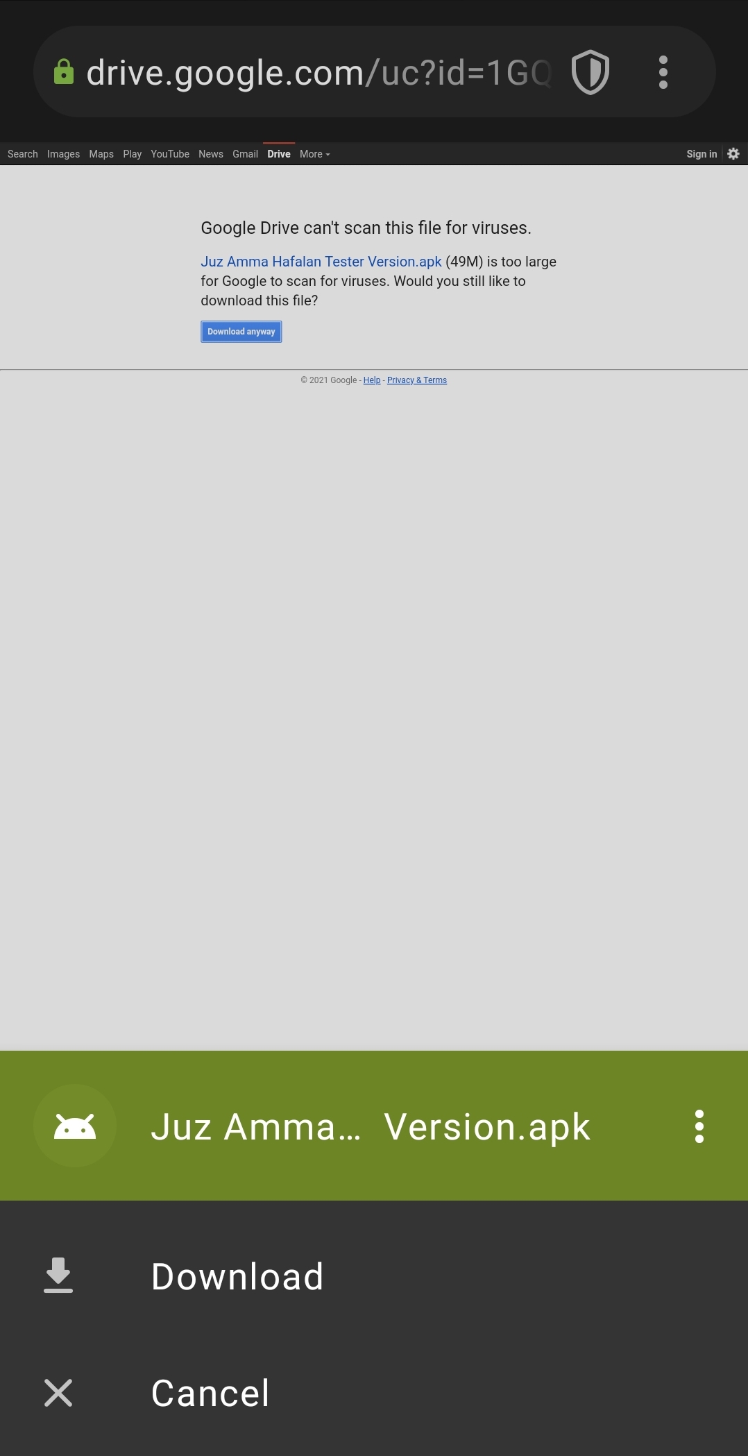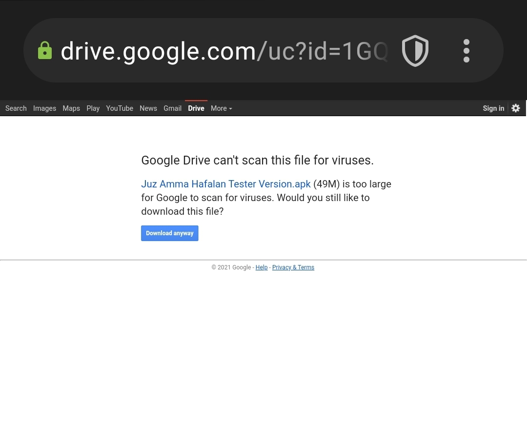 - Jika ada peringatan bahwa Google Drive tidak bisa scan virus, tekan saja tombol ‘Download anyway’. Samsam jamin aplikasi ini tidak mengandung virus.