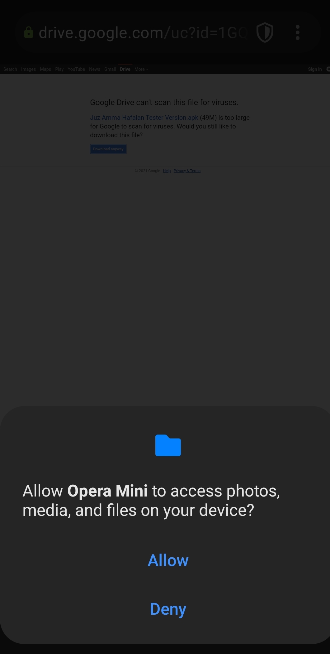 - Beri izin Opera Mini untuk menyimpan file instalasi ke dalam HP dengan menekan tombol ‘Allow’