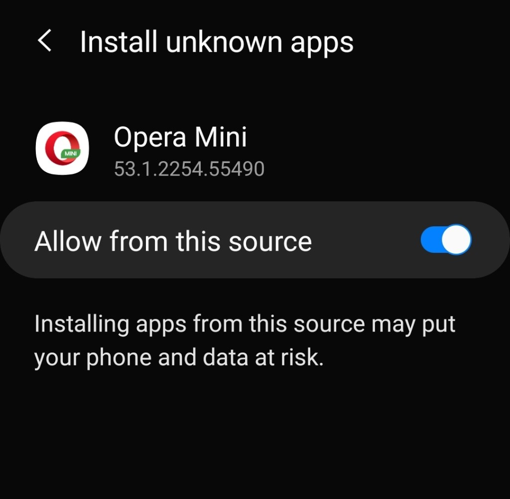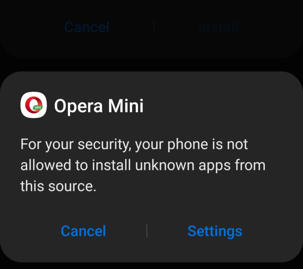 - Opera Mini akan meminta izin agar bisa melakukan instalasi dari luar Google Play Store. Lanjutkan dengan menekan tombol ‘Settings’
